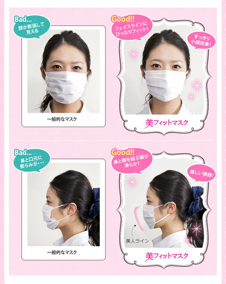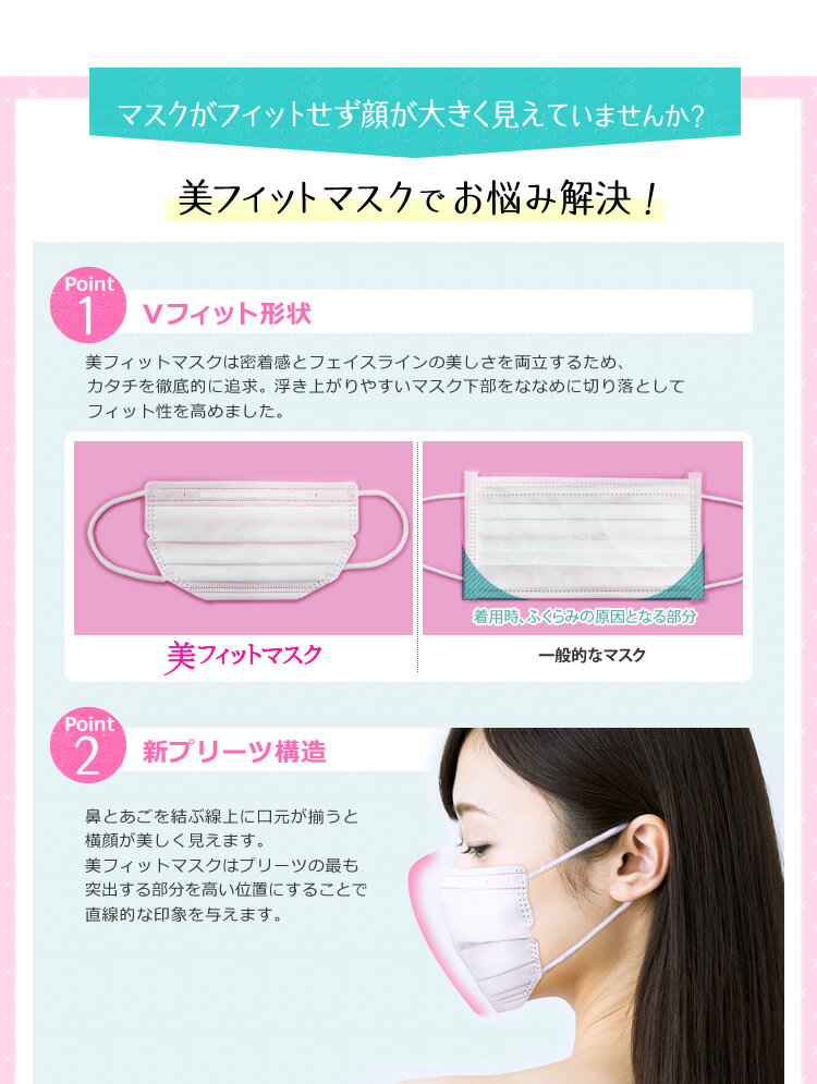■種類:小さめ・ふつう・大きめ ■内容量:7枚+1枚増量中(個包装)×10個セット ■商品サイズ(cm) 小さめ:幅約16.5×高さ約9 ふつう:幅約17.5×高さ約9 大きめ:幅約18.5×高さ約9 ■パッケージサイズ(cm) 小さめ:幅約13.5×高さ22.5 ふつう:幅約13.5×高さ23.0 大きめ:幅約13.5×高さ23.5 ■重量 小さめ:約3.8g ふつう:約3.9g 大きめ:約4.0g ■材質 本体・フィルター:ポリプロピレン、レーヨン 耳ひも:ポリウレタン、ポリエステル ノーズフィッター:ポリエチレン顔のラインに綺麗にフィットする美フィットマスクです♪